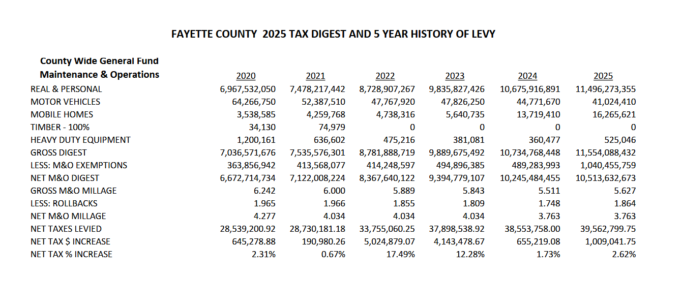 The Fayette County Board of Commissioners does hereby announce that the 2025 millage rate will be set at a meeting to be held in the Public Meeting Room at the Fayette County Administrative Complex at 140 West Stonewall Avenue in Fayetteville on December 1, 2025 at 10:00 a.m.& 6:00 p.m. and December 8, 2025 at 5:00 p.m. and pursuant to the requirements of O.C.G.A. Section 48-5-32 does hereby publish the following presentation of the current year's digest and levy, along with the history of the tax digest and levy for the past five years