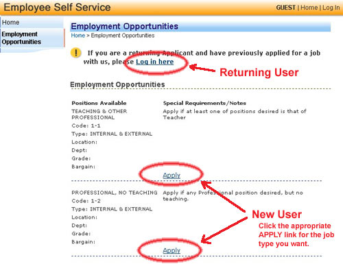 - Returning Users: Click Log in here to access your job application to make changes or additions to the application you currently have on file.