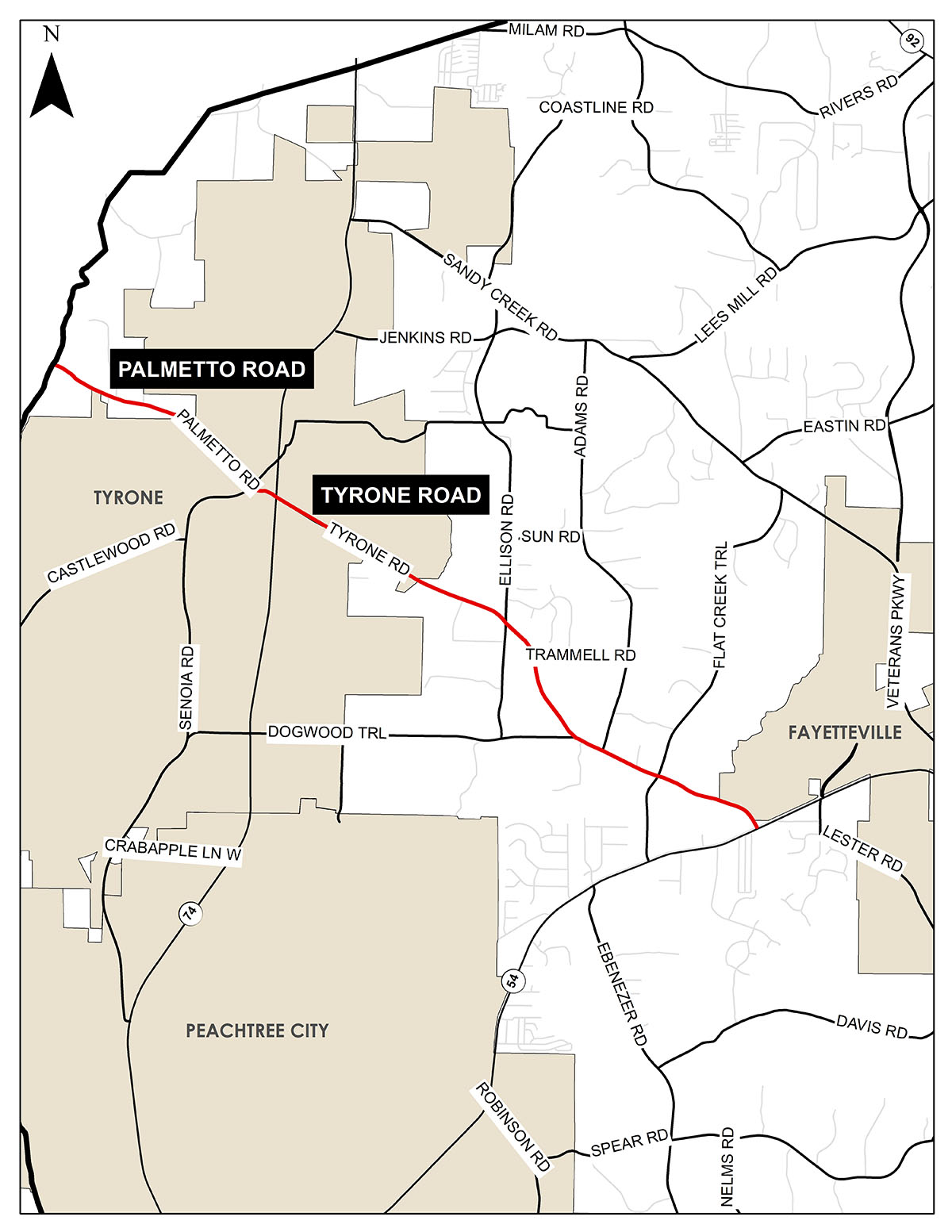 The Tyrone - Palmetto Road corridor study was completed in 2019 by Fayette County, Fayette County’s consultant, Croy Engineering, LLC, the Town of Tyrone, and the Atlanta Regional Commission. This planning study focuses on Tyrone-Palmetto Road and extends from the Fayette-Coweta County Line to SR 54/W Lanier Avenue. This corridor study is one of four corridor planning studies included in Fayette County’s 2017 SPLOST program. View the final report of the Tyrone-Palmetto Road Corridor Study through the links below.