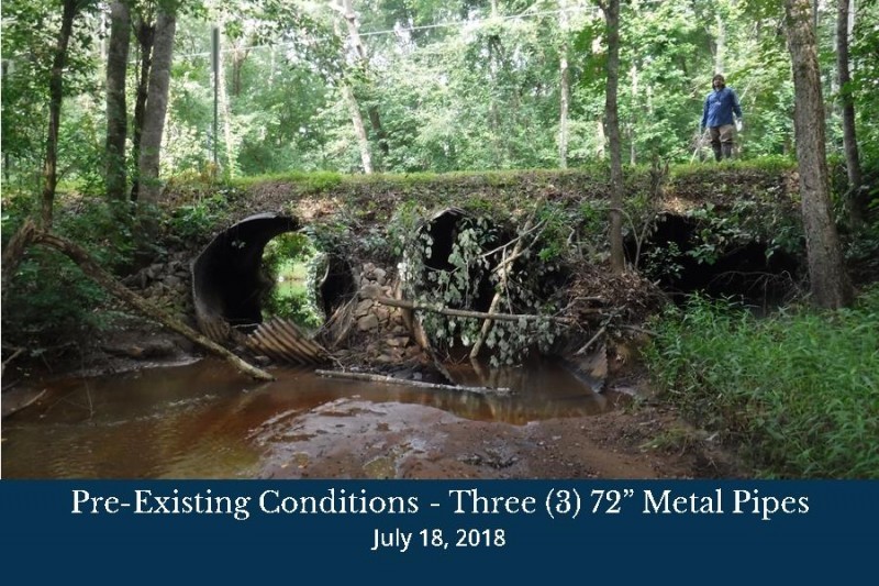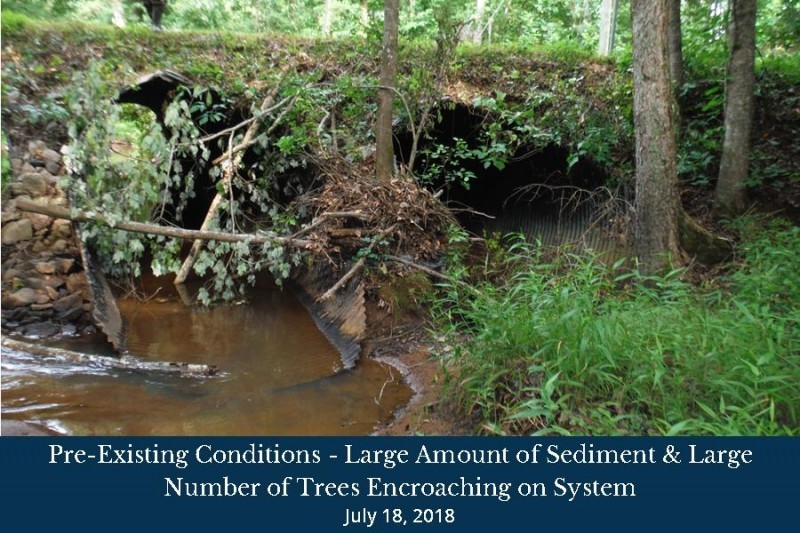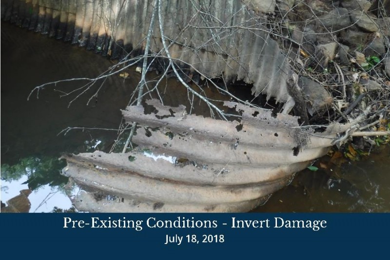 The three (3) 72” corrugated metal pipes (CMP) under Darren Drive have been evaluated for replacement. The current pipes are out of round. Each pipe has physical damage and large amounts of sediment present.