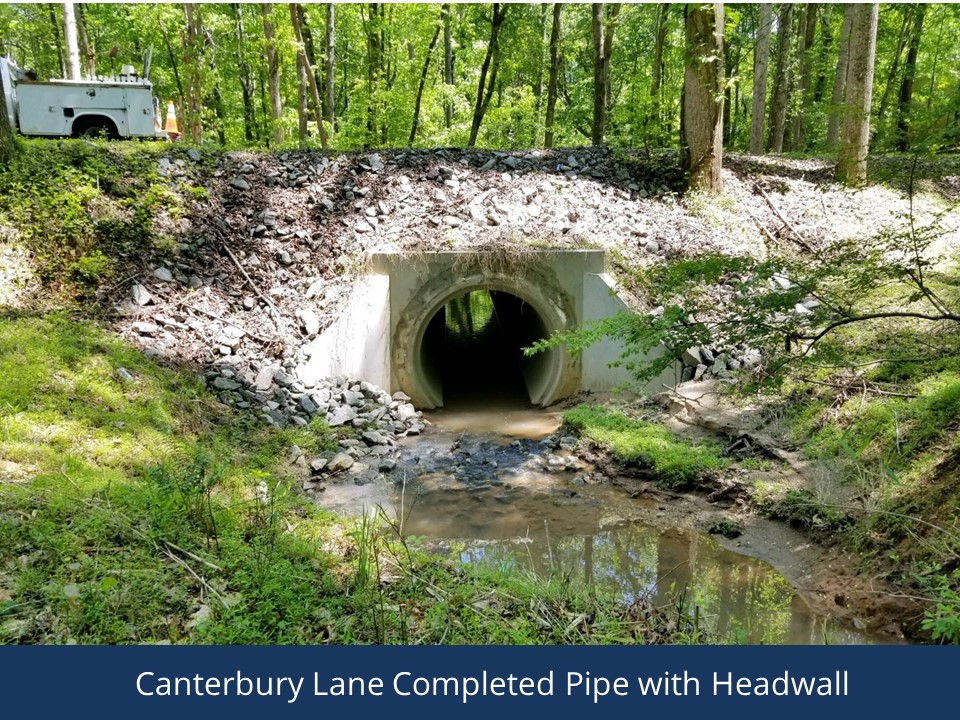 Construction involved the replacement of a failed 72" metal pipe with a 72" concrete pipe and headwalls. This project was in response to the December 2015 Flood Event that resulted in complete road and pipe failure. *Budget changes reflect action by the Board of Commissioners.
