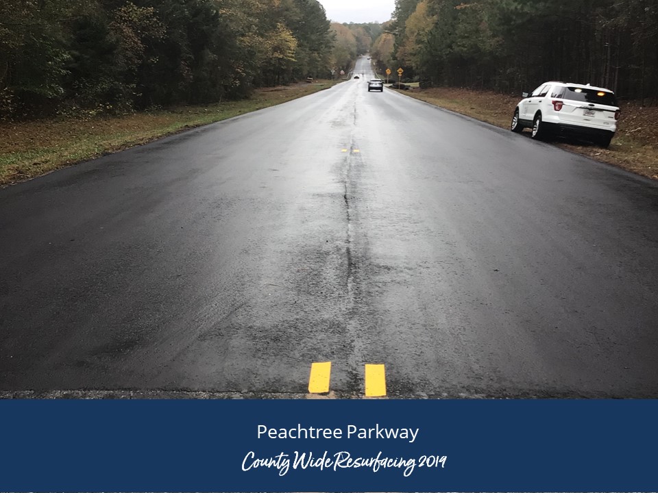 This project is complete. This was joint project between Fayette County, Peachtree City, and Fayetteville which included the resurfacing of 11.45 centerline miles of roadway for Sandy Creek Road, Peachtree Parkway, Hampton Road, Robinson Road, and Grady Avenue.*Budget changes reflect action by the Board of Commissioners.