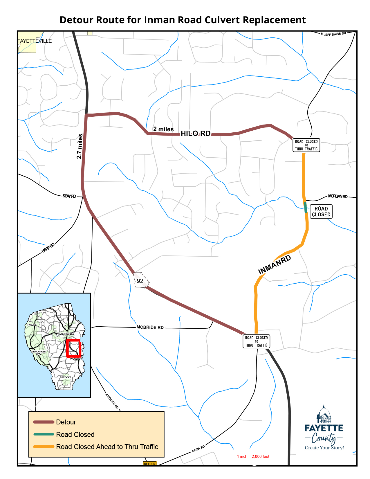 05/19/2023: Inman Road will be closed to all thru-traffic between SR 92 and Hilo Road beginning on May 30 and will reopen by July 14, weather permitting.